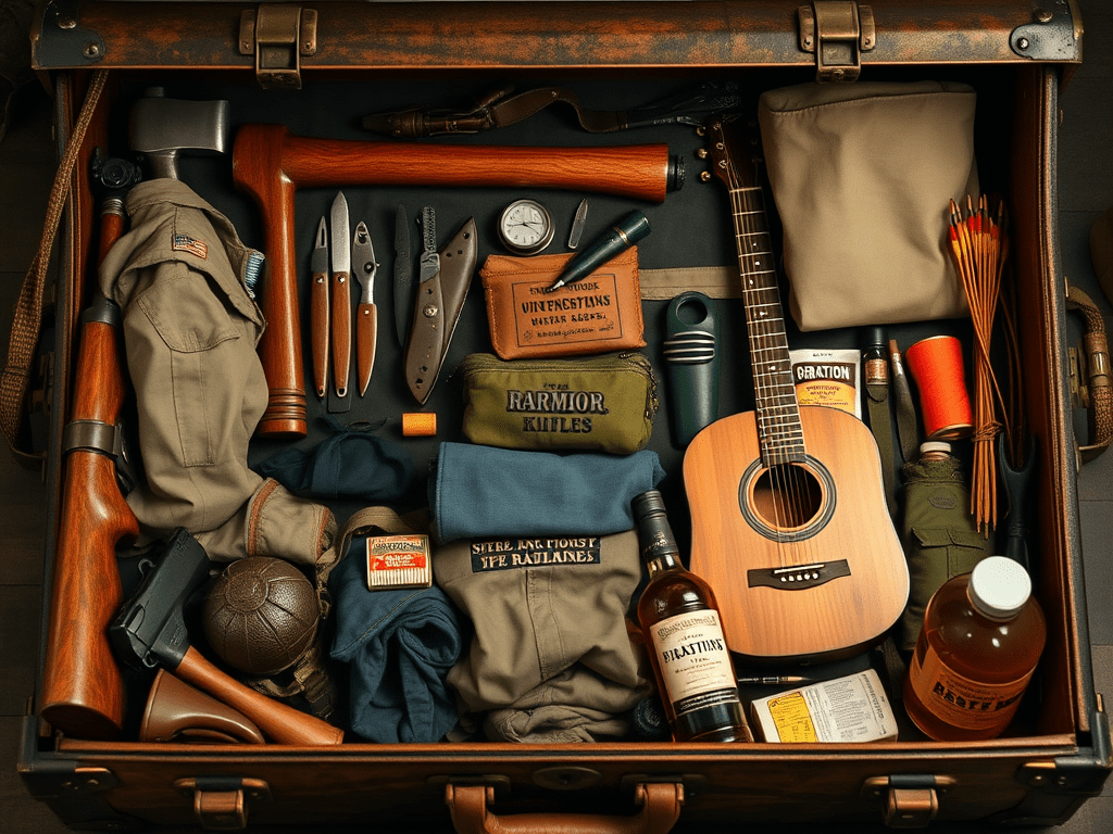 Now, if a large floating waterproof trunk washed up, or I came across an abandoned military plane from a pilot who just happens to be a man. He would also be of the same size and build, and like the same fashion of clothes that my copilot would find appealing. The large steamer trunk I found would store most of life’s necessities thrown together in a willy-nilly fashion. Hey! I heard these pilots always stashed a good bottle or two of rheumatism medicine along with a few cigars; not that I smoke anymore. Inside the trunk would be binoculars, flares, a hat, jacket, wool P-Coat, bathing suit, extra undergarments, first-aid kit, toothbrush, reading material, stashed cookies and crackers, K-rations, sewing thread and needle, plenty of dry socks, sunglasses, a parachute, which should make a pretty nice tent until I build that cabin. Also, inside bars of candy, soap, sandals, blankets, and a pillow wrapped neatly around a Martin D-45 acoustic guitar with accessories, e.g., an endless supply of strings, plectrums, and a tuning rod in E. Hey, you put your dream trunk together anyway you want; this is my dream find!