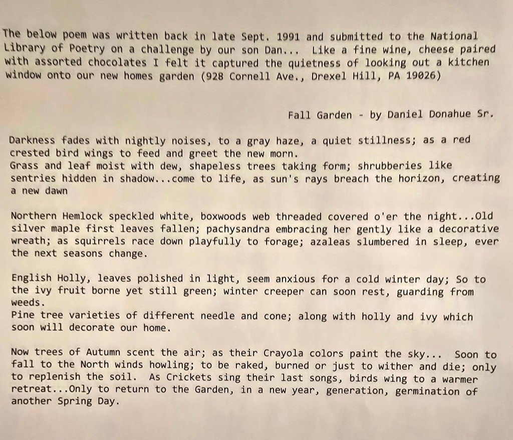 To that point, over the years, it’s been a challenge for me to do things that force me to make plans and set goals now in retirement, in my personal interest, these past several years. Many years ago, in my 40s, I designed, drew up plans, and rules for a board game to the point of even having it patented but not trademarked. It’s probably sitting at the bottom of some drawer or worse, since moving 8 years ago. Then my eldest son challenged me to submit a poem to the Library of Congress from an ad he saw in the Sunday Comics, of all places, which we both did and were published in 1991. I didn’t want to let him down, but it seemed like it was more of a way that if your poems were decent enough, they would publish them to sell books. My first published work in 9/1991 called, Fall Garden
