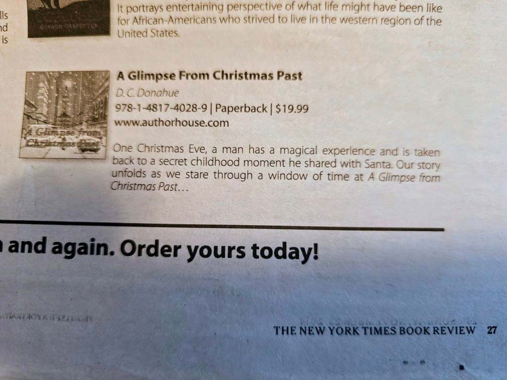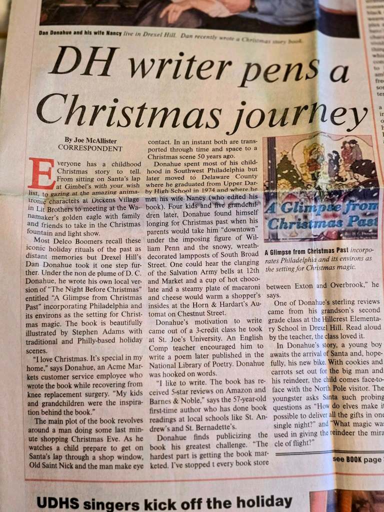 Writing a Christmas story in 2013 inspired by the oldest three of our eight grandchildren, when they were younger, and before five of them were born or even celebrated their first birthday. When I read the story to them, they urged me in unison to publish it, and that’s how I became an author. Throughout my journey, I have learned about the processes, marketing, advertising, sales, and the challenges of getting people to write and post reviews. It also exposed me to public speaking on a personal front while visiting local schools. That being said, though I have yet to break even, it has been featured in the Delco Times, NY Times Book Review, and the like. I haven’t quite broken even yet; however, my grandkids had better insight than I. The book is now 12 years old, has been purchased in 20-plus countries, giving it international status, which, all things considered, is not bad for a Philadelphia Holiday Story. It has a 5-star rating and is available at most online bookstores in e-read and printed book formats, as well as at http://www.A-Glimpse-from-Christmas-Past@Audible.com