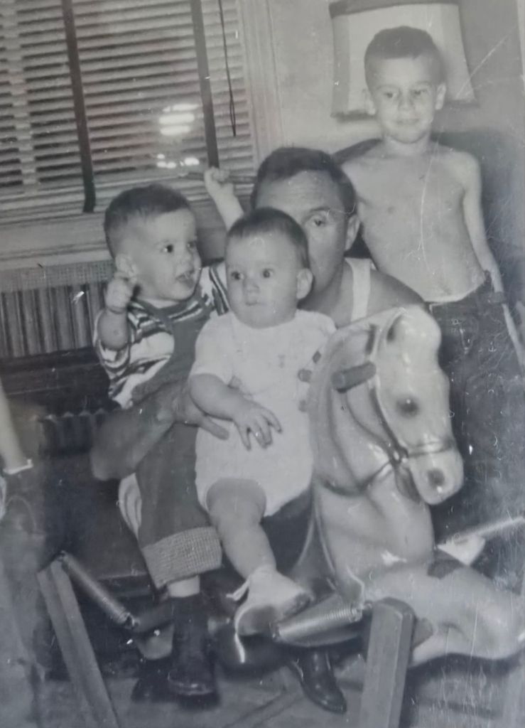 He and my mother would marry in September of 1942, when he was on leave. They married, and I am the next-to-youngest of 7 siblings born between 1945 and 1958. Point of note on February 10, just 15 days before I would turn two, my dad had a stroke while driving the El out of 69th Street for PTC (Phila. Transit Company, now part of SEPTA). He would need to learn to walk/talk and, once better, manage a household of 7 children. My mom was 5 months pregnant with my kid sister at the time. My dad wouldn’t get home until a month after my sister was born in September of 1958. Needless to say, Mom’s story is one for the books. Through it all, they managed it all, and we never once heard them complain, for it wasn’t in their nature. Needless to say, I have been very blessed in life, and who could or would ever complain after living in my small part of their story? FYI! The picture of my dad holding my kid sister, Annemarie, with my late brother Larry (L) and me (R), both in cowboy hats, was taken at Christmastime a few months after he got home from the hospital.