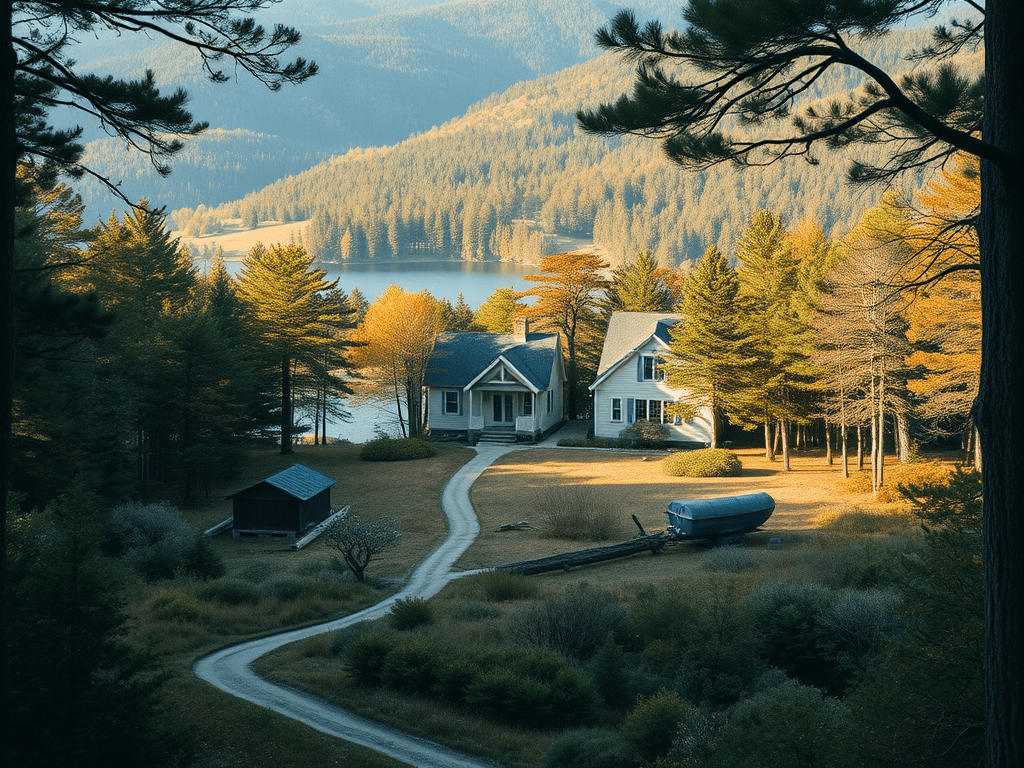 The view from the porch or either window, for that matter, looks towards a mountain lake or pond, surrounded by a clearing that gently fades into the distant woods of birches, aspens, elms, maples, conifers, and more. In the distance, two inviting leaf-covered paths meander into the woods: one disappears around a bend, while the other splits in several directions before vanishing from view, yet both urge you to come and explore.